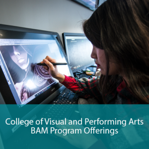 The College of Visual and Performing Arts offers several options for our undergraduate students to start working on their Master’s degree while completing their Bachelor’s degree. Completing one of these degree paths opens doors throughout the world of the visual and performing arts, where graduates can pursue careers as performing artists, entrepreneurs, gallery directors, curators, managing directors, professors, artistic directors, teachers, and more!